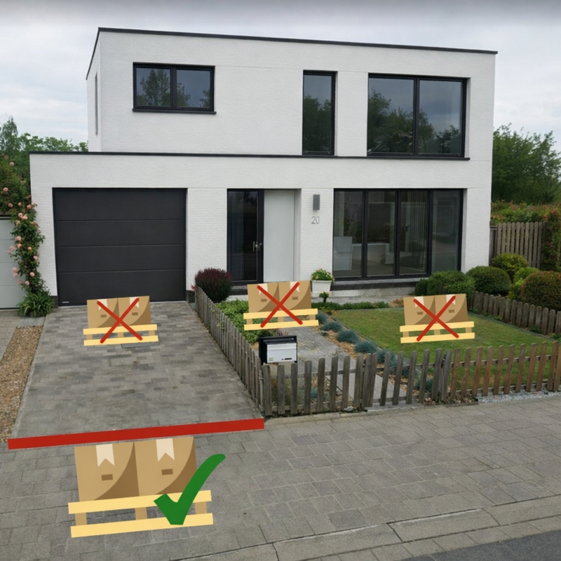 Woon je in een rijhuis of woning zonder oprit? Zorg dan dat je thuis bent of de nodige maatregelen hebt getroffen om de bestelling af te laten leveren. Zo kan je met de gemeente bespreken om een (parkeer)plaats voor je woning te laten afzetten, waar we jouw materiaal kunnen achterlaten.