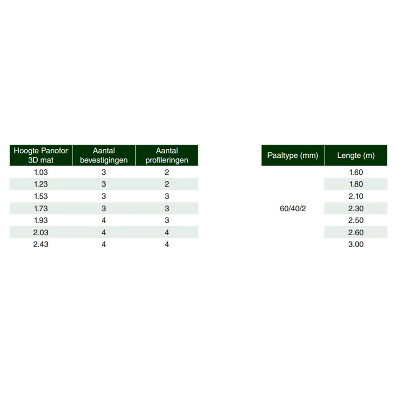 Voor extra stabiliteit en bescherming kan je de afsluiting uitbreiden met betonplaten onderaan. Deze voorkomen dat mollen of andere dieren onder de afsluiting door graven en beschermen bovendien de onderzijde van het draad. Bij H-palen gebruik je betonplaten van 250 cm, terwijl bij 2D/3D-palen betonplaten van 245 cm lengte geschikt zijn.