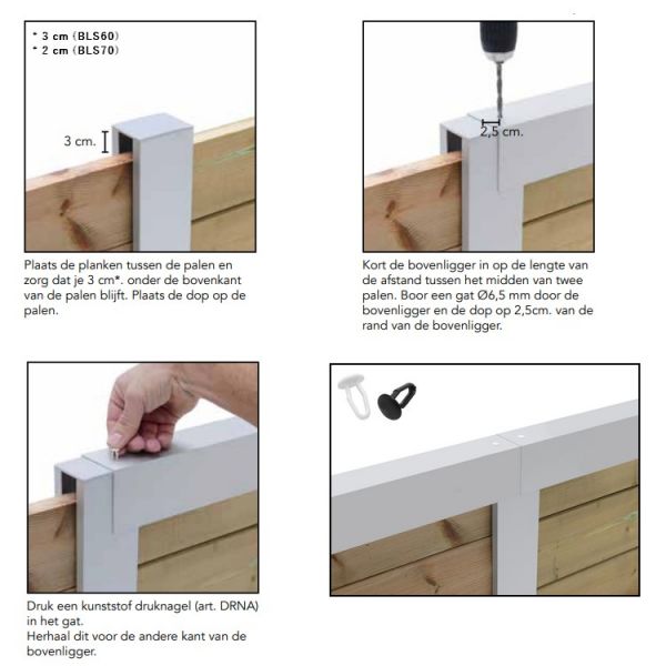 Afmetingen: BLS60: 80 x 64 x 80 x 2220 mm (geschikt voor gleufpalen GL23, GL30 en GL36) BLS70: 40 x 75 x 40 x 2100 mm (geschikt voor gleufpalen GL48, GL51 en GL54) LHBLS: 46 x 60 x 40 mm (L-profiel om een hoek te vormen bij bovenregels)