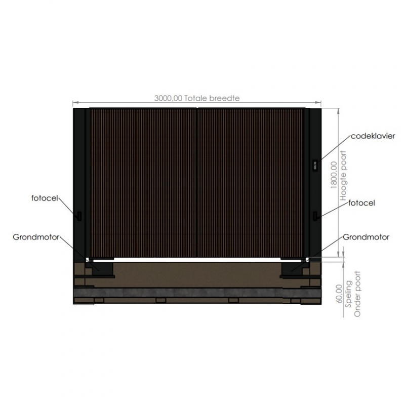 De poortbekleding bestaat uit thermo-ayous triple blokprofiel (20 mm dik), enkelzijdig aangebracht aan de straatzijde en volledig gesloten, wat optimale privacy biedt.
