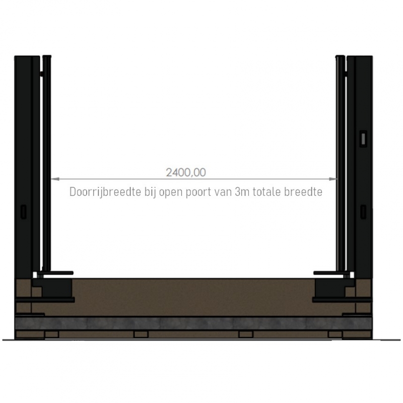 De poort is heel eenvoudig zelf te installeren: plaats hem, zet de horizontale funderingsbalken in stabilisé vast, en hij is klaar voor gebruik. Verkrijgbaar in meerdere afmetingen, zodat hij perfect past bij jouw oprit.