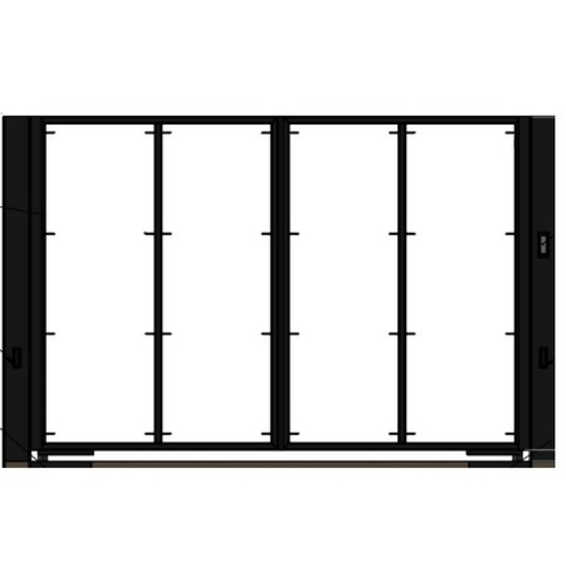 De poort beschikt over een gemetalliseerd en gepoederlakt metalen frame (40 x 40 mm) in zwart RAL 9005 textuur, gemonteerd op een funderingsframe met grondmotor en twee gelakte palen van 150 x 150 mm.