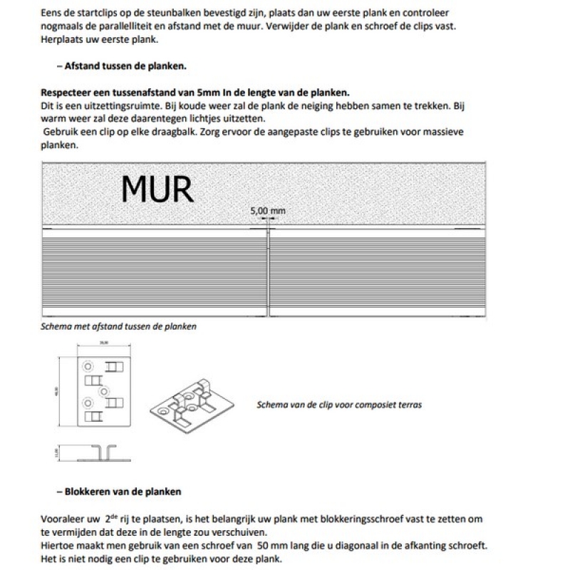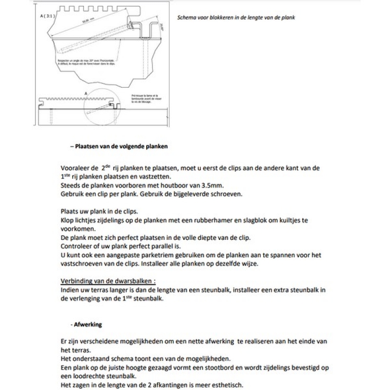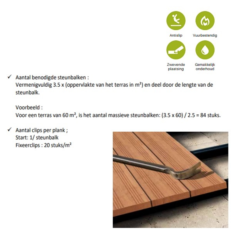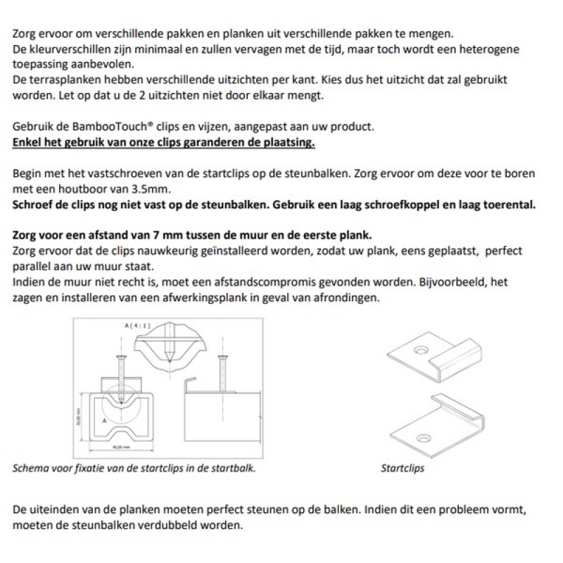 De bamboe composiet terrasplanken laten zich vlot en nauwkeurig installeren wanneer je gebruikmaakt van de juiste toebehoren. De bijhorende composiet steunbalken vormen de ideale basis voor een stabiele en duurzame terrasopbouw, omdat ze sterk, vormvast en uitstekend bestand zijn tegen vocht. Voor een onzichtbare en strakke afwerking wordt gewerkt met start-, fixeer- en eindclips, allemaal vervaardigd uit behandeld RVS A2 voor een lange levensduur. De clips klemmen de planken stevig vast zonder ze te beschadigen, waardoor het terras een egale, hoogwaardige uitstraling krijgt zonder zichtbare schroefkoppen. Dankzij de zelfborende schroeven monteer je het hele systeem efficiënt en met minimale inspanning.