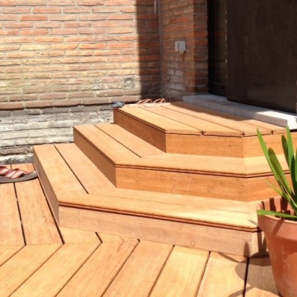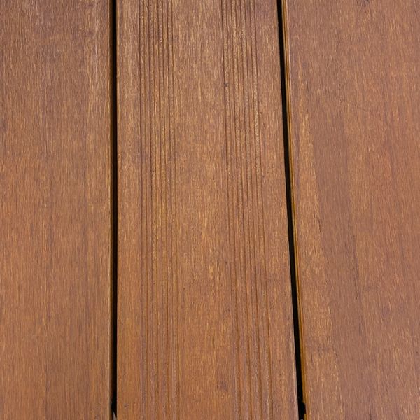 Het bamboe terras Ceylon heeft een oranjeachtige kleur die na verloop van tijd lichter zal worden. Deze lichtere kleur is verkregen door bamboe-strippen met hoge druk tegen elkaar te persen. Hierdoor zijn de groeiknopen van de bamboe ook zichtbaar in de terrasplanken. Dit geeft de planken een natuurlijke uitstraling om uw terras een landelijke toets te geven. Naast het kleurverschil heeft de plank ook een andere eigenschap die deze plank uniek maakt. Het Ceylon terras heeft namelijk een speciale ribbel (dubbele Franse kam) in plaats van een gewone geribbelde kant. Aan de andere kant zijn deze planken gewoon vlak, wat u ook kunt gebruiken voor uw project. Doordat de plank met hoge druk samengeperst is verkrijgt deze een hoge hardheid. Hierdoor is de plank heel krasbestendig en gaat het terras niet snel schade oplopen. De planken hebben standaard een dikte van 2 centimeter en zijn verkrijgbaar in breedtes van 13,7 centimeter, 14 centimeter en 18 centimeter. U kan kiezen voor terrasplanken met de standaard clip-bevestiging, waarbij u elke plank bevestigt via de groef aan de zijkant. U kunt echter ook kiezen voor het iDecking clicksysteem, waarbij de planken vastklikken in de metalen onderstructuur. Wanneer u dit terras bestelt per vierkante meter, houden we rekening met een spatie van 0,75 centimeter tussen alle planken.