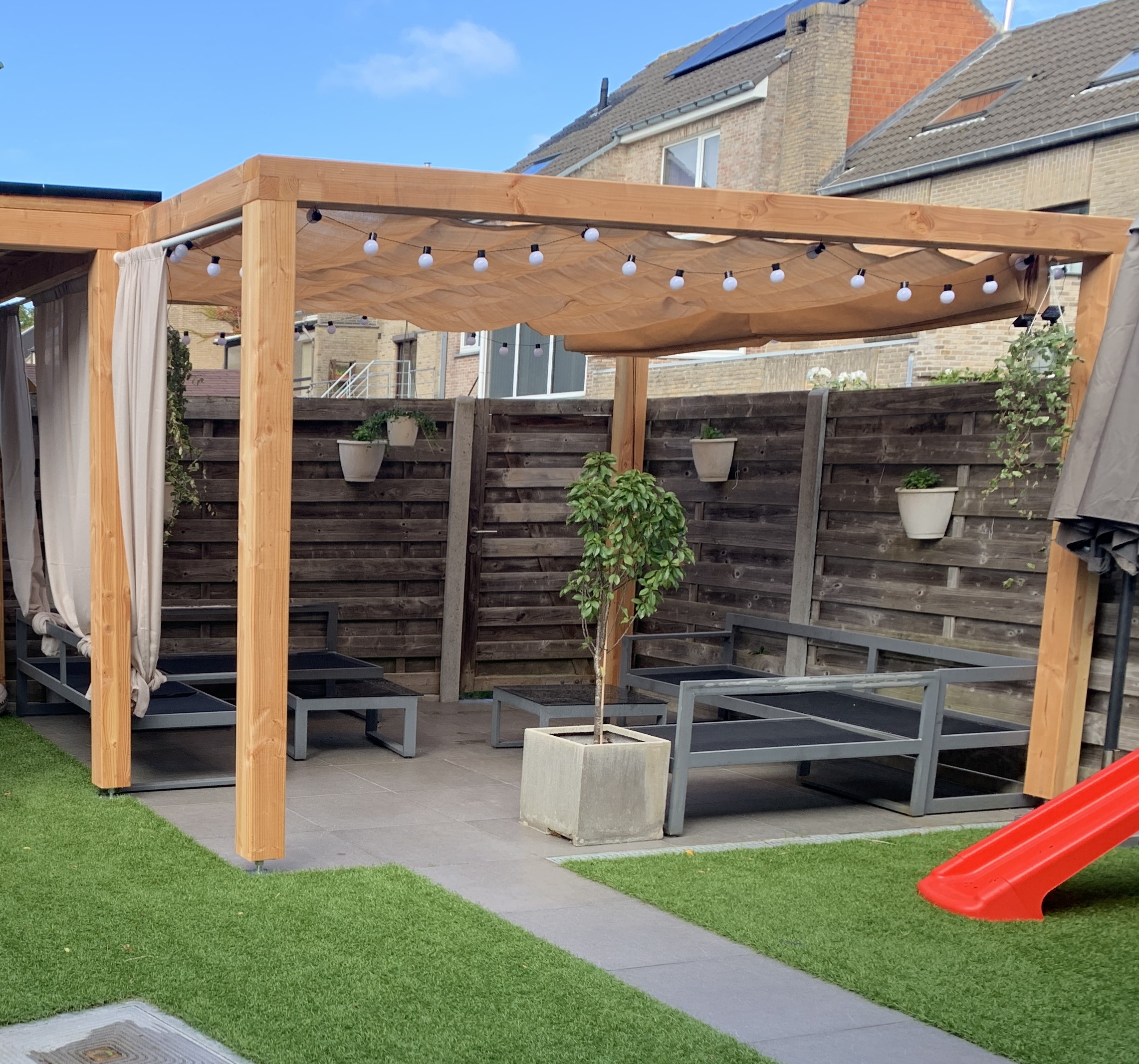 De warme tinten en opvallende houtstructuur geven de pergola een natuurlijke charme. Doorheen de tijd evolueert het hout naar een prachtige zilvergrijze kleur.