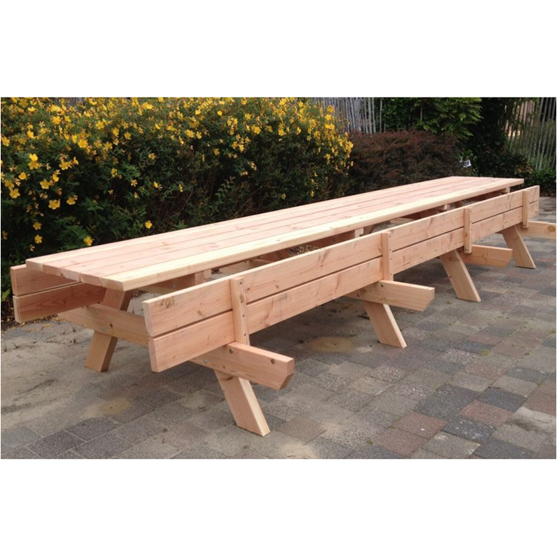 Deze Classic XXL in Douglas is de perfecte keuze voor wie een grote, strakke picknickbank wenst met een moderne uitstraling. Dankzij de rechte planken oogt de bank bijzonder verzorgd en past ze perfect in commerciële settings zoals horecaterrassen, campings of scholen. De 5 meter lengte biedt enorm veel zitruimte, ideaal voor grote groepen of gezinnen. Douglas is een stevige en duurzame houtsoort die zich uitstekend leent voor buitengebruik. Zelfs na jaren buiten blijft de bank stabiel en aangenaam in gebruik.