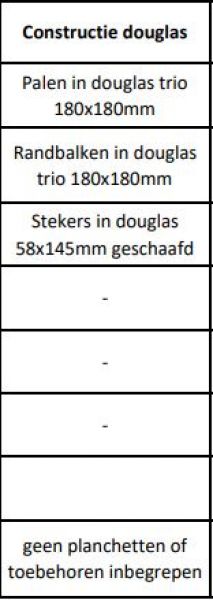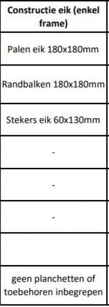 Zoek je naar een bouwpakket met staanders/palen en ringbalken in eik of douglas/lariks? Dan hoef je niet langer wakker te liggen van het zaag- en freeswerk dat er anders bij het bouwen van een constructie aan te pas komt. Met onze bouwpakketten of modules ben je zeker dat alle verbindingen reeds voorzien zijn om alle afzonderlijke onderdelen als puzzelstukjes aan mekaar te monteren. Het bouwpakket Cannes bestaat uit staanders en draagbalken van 18 x 18cm om een optimale stevigheid te garanderen. De schoren of strevers zijn ook inclusief bij al onze bouwpakketten zonder dak. Het pakket is perfect bruikbaar voor een toepassing als carport, bijgebouw, lounge, overkapping of schuur op 3 x 6m of 4 x 8m en heeft geen dakconstructie. Je kan dus nog alle kanten uit om het geheel open te laten of te voorzien van een plat of groen dak. Met douglas kies voor je een budgetvriendelijk alternatief voor eik. Douglas, ook wel lariks genoemd, heeft een sierlijk gevlamde houttekening en bevat meer uitgesproken noesten dan eik. Wanneer jouw voorkeur uitgaat naar eik (Franse origine), kies je voor een zeer charmante uitvoering, met een robuuste look-and-feel, die luxe uitstraalt. Beide houtsoorten zijn alvast eenvoudig in zowel een strakke, minimalistische als een landelijke tuin in te passen. Eik = vers gezaagd + geschaafd Lariks = verlijmd en gevingerlast volgens sterkteklasse C24 + geschaafd Zie foto's i.v.m. verdere technische info en afmetingen.