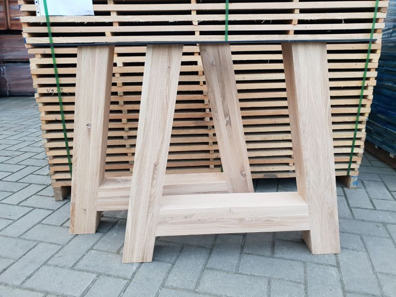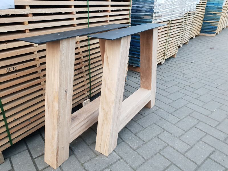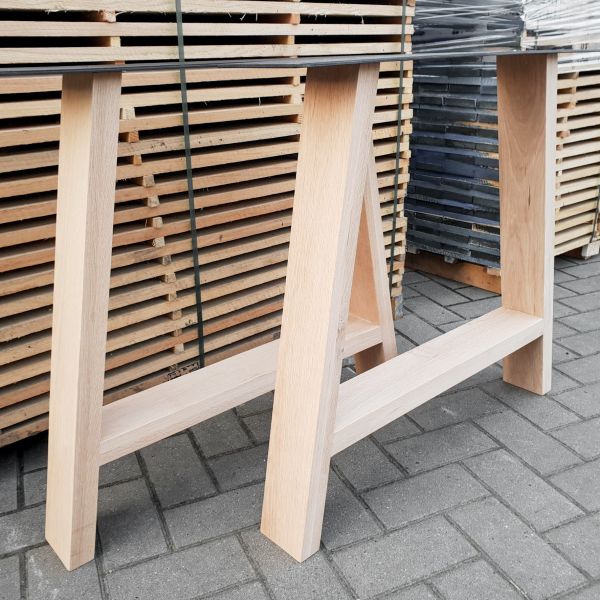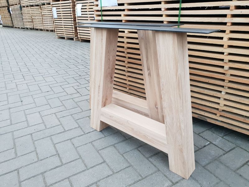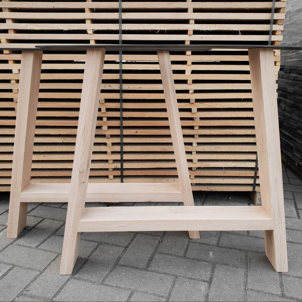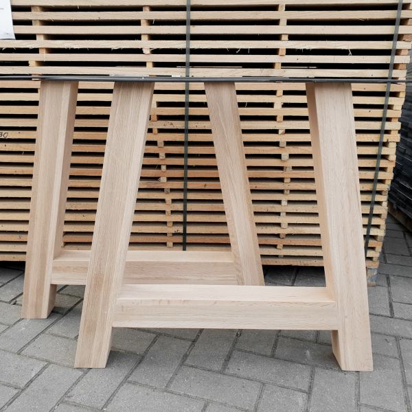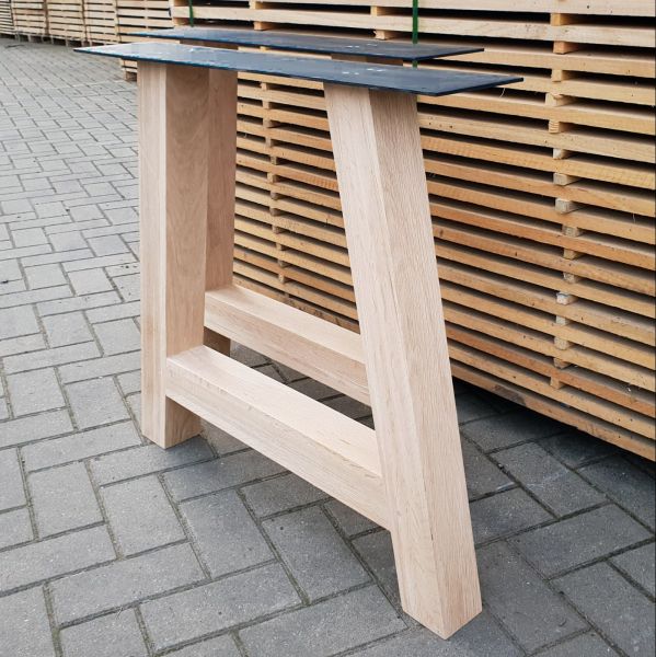 Deze onderstellen zijn vervaardigd uit massief/rustiek eikenhout en kunnen gebruikt worden onder zowat elk blad. Ze zijn reeds fijn geschuurd, de poten hebben een dikte van 80 mm en zijn 100 mm breed en 720 mm hoog, ze zijn nagenoeg foutloos doordat de knopen zijn opgevuld met vulmiddel. Deze A-poot is tevens voorzien van een stalen montageplaat, afgewerkt met een hoogwaardige zwarte poedercoating.