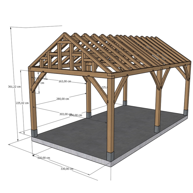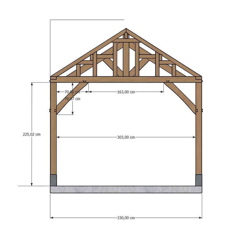 Dit bouwpakket is ontworpen voor een bijgebouw met zadeldak en wordt geleverd met al het nodige hout, klaar voor plaatsing. De buitenmaat van het gebinte bedraagt 3,30 × 6,00 meter. De totale hoogte bij de nok is circa 361 cm, met een comfortabele doorloophoogte van circa 225 cm (bij plaatsing op arduinen sokkels). De vrije overspanning tussen de staanders is circa 303 cm.