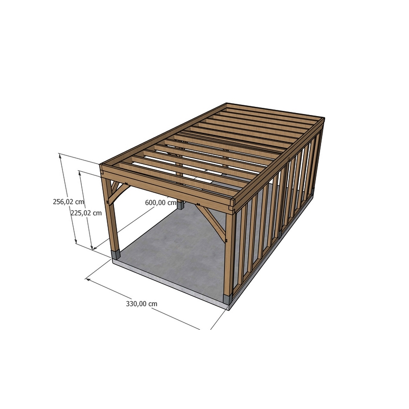 Voorzien voor zijwandafwerking, plat dak, zonder oversteek met een doorloophoogte van circa 200 cm (of 225 cm bij plaatsing op arduinen sokkels). Dit gebinte is exclusief gevelbekleding, dakafwerking en toebehoren zoals arduinen sokkels.