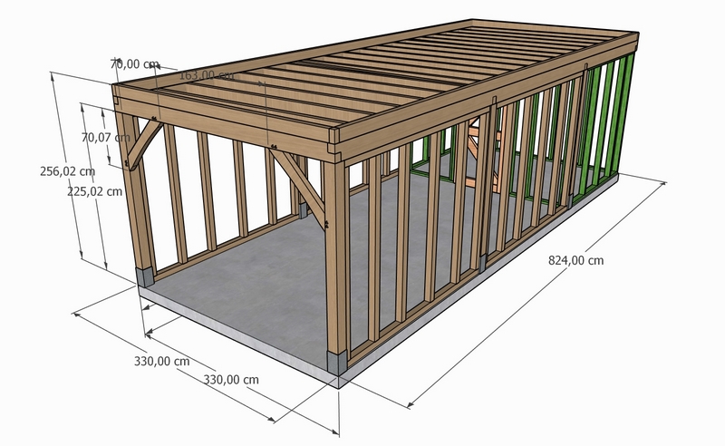 De totale constructie meet 3,30 meter breed bij 8,24 meter lang. De berging heeft een diepte van 2,24 meter, ideaal voor het opbergen van tuinspullen of poolhouse-accessoires, terwijl het open gedeelte van 6 meter diep perfect dienstdoet als carport of overdekt terras.