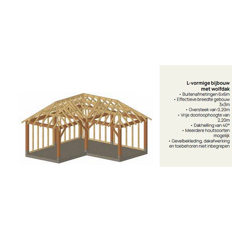 Ben je op zoek naar een module of bouwpakket voor jouw bijgebouw, poolhouse of overkapping? Dan is een gebinte in eik zeker het overwegen waard. Het gebinte Walbourg betreft een module van 6 op 6 meter in een L-vorm, met een effectieve breedte van het gebouw van 3 op 3 meter. Dit maakt het perfect mogelijk om een binnenkoer te creëren of een multifunctionele inrichting van de aanbouw te voorzien.
