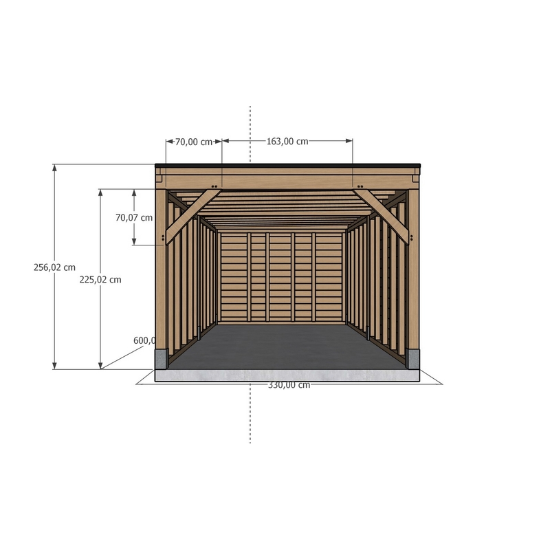 De carport heeft een buitenmaat van 3,3 m x 6 m, ideaal voor één wagen of als compacte opslagruimte.