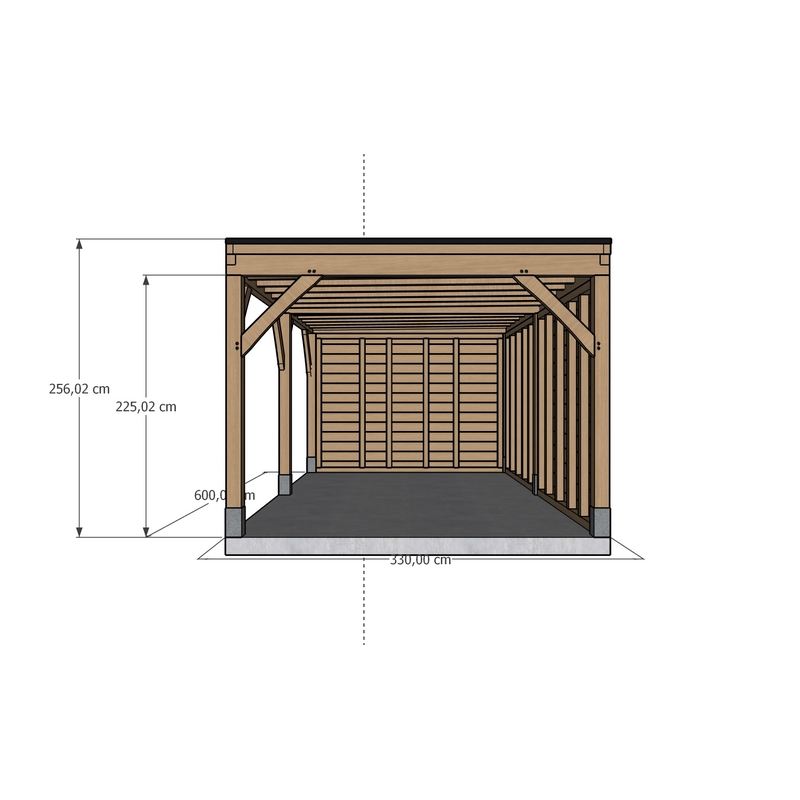 Deze carport meet 3,3 m op 6 m – een praktische afmeting voor inrit of oprit. Inclusief de stevige sokkels bekom je een comfortabele doorrijhoogte van ongeveer 225 cm.