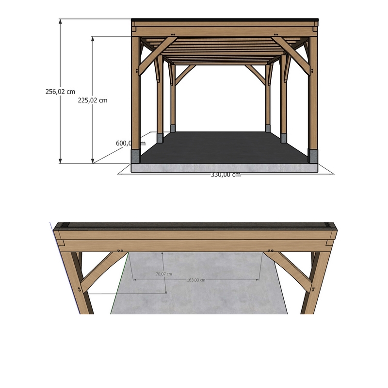 Het ontwerp meet 3,3 meter breed en 6 meter lang, geschikt voor één wagen, met een modern plat dak zonder overhang en een doorrijhoogte van ±225 cm op sokkels.