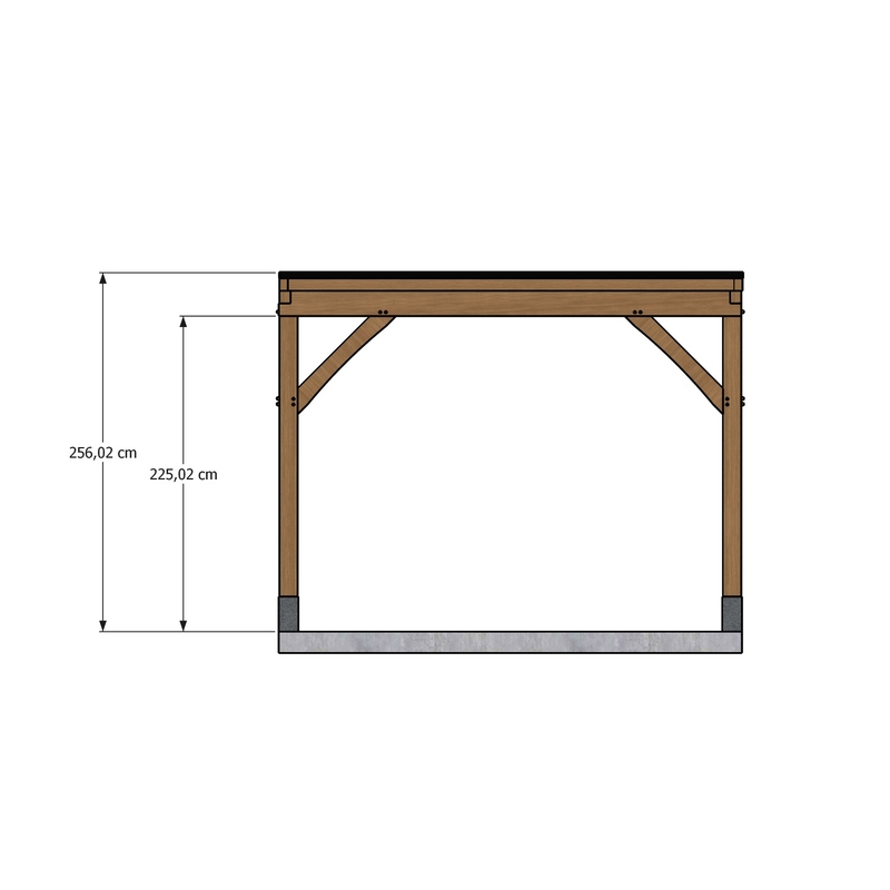 Plaats de carport op een vlakke, volledig uitgeharde fundering in beton of stabilisé. Veranker de stalen kernen van de arduinen sokkels waterpas in de vloer en boor onderaan in elke eiken paal een passend montagegat, diep genoeg zodat de paal volledig op de sokkel rust zonder het anker te raken.