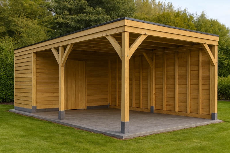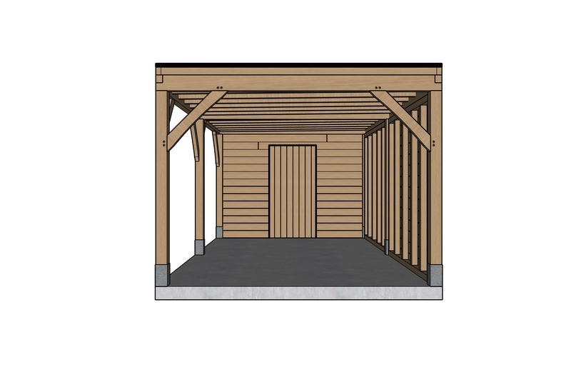 De draagstructuur van de overkapping – bestaande uit staanders, schoren en ringbalken – is volledig uitgevoerd in massief eiken. Eén zijwand van de overkapping en de berging zijn bekleed met eiken sidings van 22 × 155 mm, terwijl het onderdak wordt voorzien van eiken planchetten van 15 × 130 mm (30 m²).