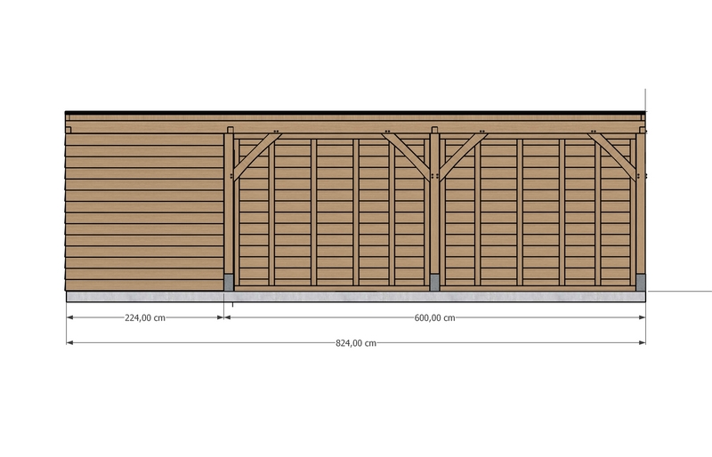 De volledige constructie meet 3,30 meter in breedte en 8,24 meter in lengte. De gesloten berging heeft een diepte van 2,24 meter, terwijl het carportgedeelte 6 meter diep is. De vrije doorloophoogte bedraagt ongeveer 225 cm, inclusief een sokkelhoogte van 25 cm met arduinen sokkels van 14 × 14 cm.
