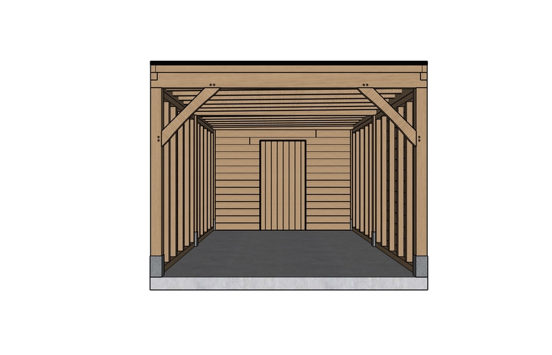 De constructie valt meteen op door de warme, natuurlijke uitstraling van de eiken sidings waarmee de berging en twee gesloten wanden zijn bekleed. Het gebinte bestaat uit massieve, geschaafde en voorgefreesde eiken balken. Dankzij de nauwkeurige houtverbindingen schuift alles soepel in elkaar, waardoor de montage verrassend vlot en stevig verloopt.