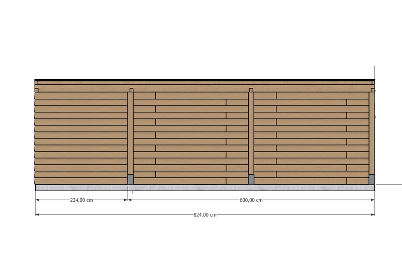 De totale constructie is 3,30 meter breed en 8,24 meter lang, met een berging van 2,24 meter diep en een carportgedeelte van 6 meter.