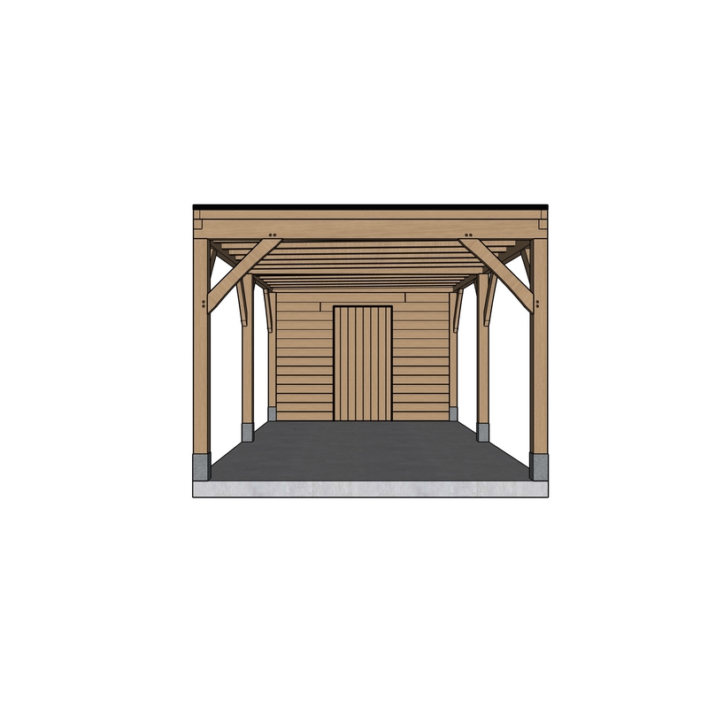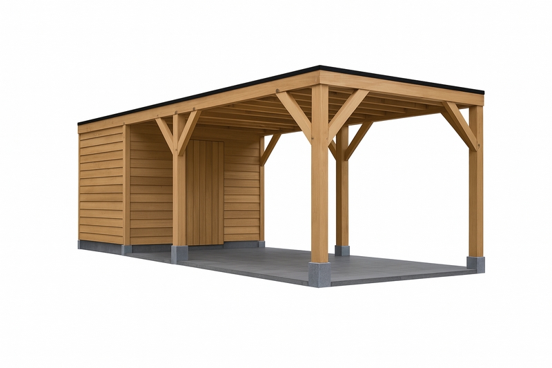 Deze carport met berging is een compleet zelfbouwpakket, waarbij de nadruk ligt op de natuurlijke kracht van eikenhout. De hoofdconstructie bestaat uit massieve, geschaafde eiken balken die bekendstaan om hun duurzaamheid en warme uitstraling.