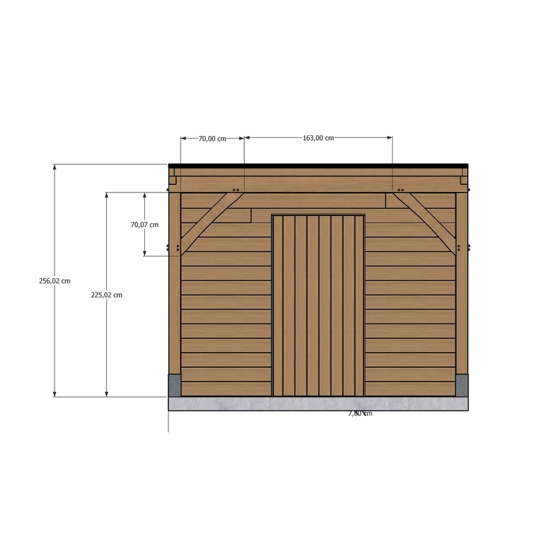 Wanden (berging): Skelet van gedrenkt SLS-hout, éénzijdig bekleed met eiken sidings.