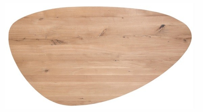 Voor deze organische vorm is een slank onderstel of centrale poot zeer geschikt: zo komt de kiezelvorm volledig tot zijn recht en blijft de tafel overal goed toegankelijk. Behandel het blad na montage met een hoogwaardige olie die bescherming biedt tegen vlekken en vocht, en onderhoud dit periodiek om de diepe eikenkleur te behouden. Gebruik onderzetters en vermijd hete pannen rechtstreeks op het blad om de afwerking te beschermen. Dit model past perfect in zowel moderne als natuurlijke interieurs en vormt een subtiel maar opvallend designstatement.