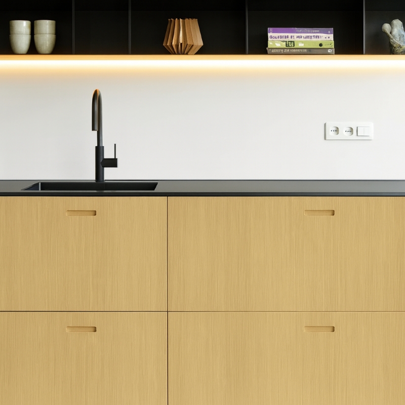 Gebruik een geschikt zaagblad om de fineerlaag mooi splintervrij te zagen en werk de zichtbare randen af met bijpassende fineerkant voor een uniforme afwerking. Monteer de fronten met scharnieren of ladegeleiders die afgestemd zijn op de gekozen dikte, zodat de fronten perfect uitlijnen en soepel bewegen. Laat de panelen acclimatiseren in de ruimte voor montage, zodat temperatuur en luchtvochtigheid in balans komen. Een afwerking met olie of lak beschermt het houtbeeld en benadrukt het subtiele lijnpatroon van het vals kwartiers fineer. Met een zorgvuldige montage creëer je een keukenfront dat jarenlang strak, warm en stijlvol blijft.