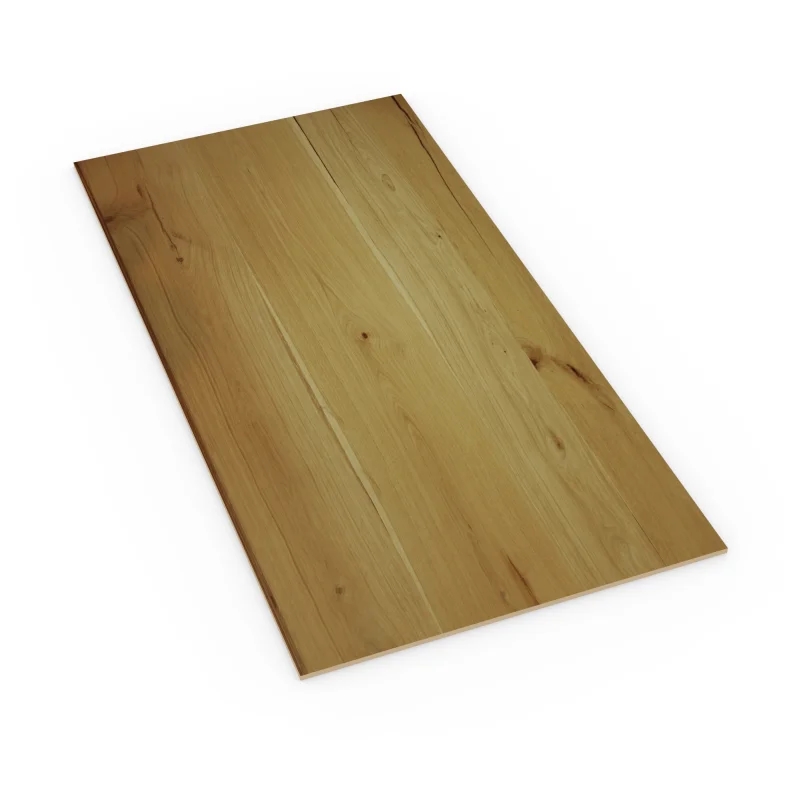 Het paneel is afgewerkt met echt eikenfineer in een A/B-kwaliteit. Dit betekent dat de zichtzijde (A) van hoge, egale kwaliteit is en de achterzijde (B) een eikenfineer is met lichte variaties. De 'Balkeneik' uitstraling kenmerkt zich door een rustiek design met zichtbare nerven en onvolkomenheden, wat het natuurlijke, onbehandelde karakter van eikenhout nabootst.