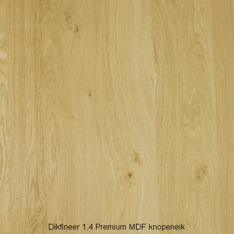 De panelen zijn afgewerkt met echt eikenfineer in een A/B-kwaliteit. De natuurlijke 'knopeneik'-uitstraling kenmerkt zich door de aanwezigheid van noesten en een levendige houttekening, wat de panelen een rustiek karakter geeft. De kleur van het fineer is een natuurlijke, warme eikenkleur.