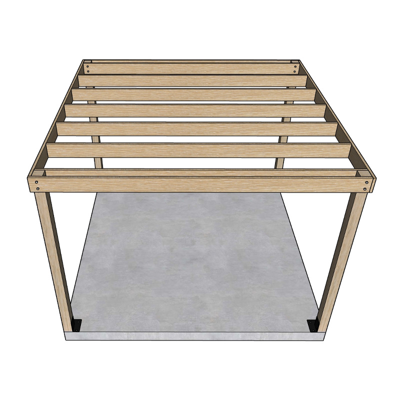 De opbouw verloopt eenvoudig: plaats eerst de vier metalen voeten en bevestig de staanders. Daarna volgen de ringbalken en vervolgens de dakspanten. Voorboren van het eikenhout wordt sterk aangeraden om splijten te voorkomen en een mooie afwerking te garanderen.
