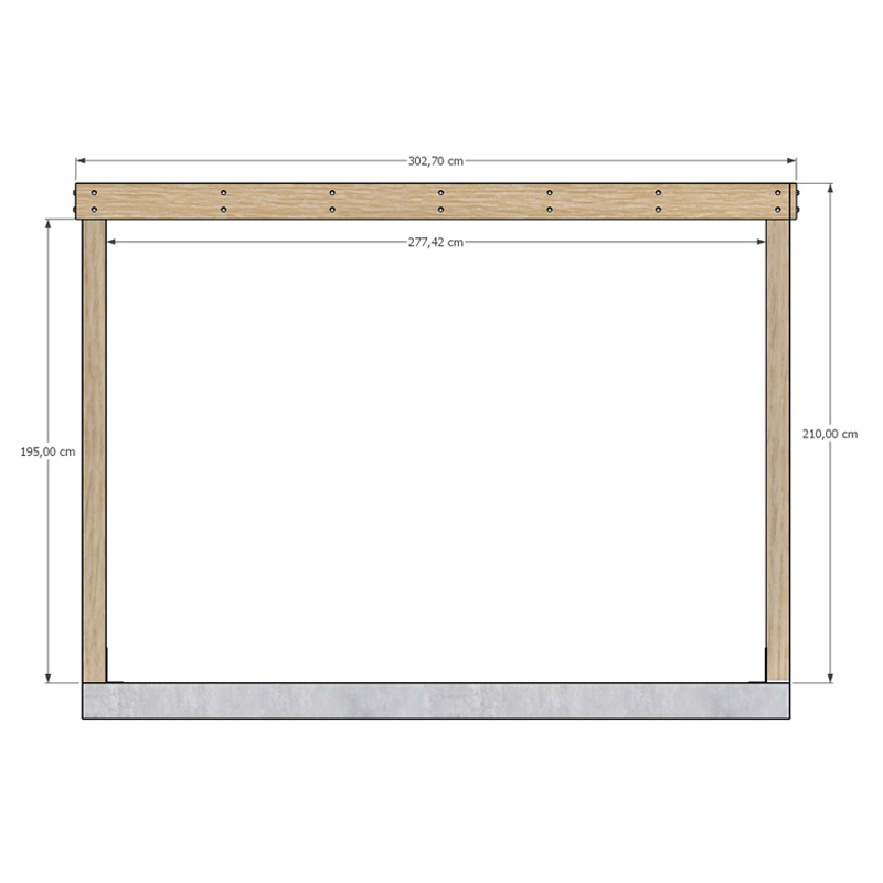 De pergola heeft een breedte en lengte van 302,7 cm. Met een vrije doorgang van 195 cm en een totale hoogte van 210 cm creëer je een open, luchtige structuur die toch voldoende hoogte biedt voor decoratie en beplanting.