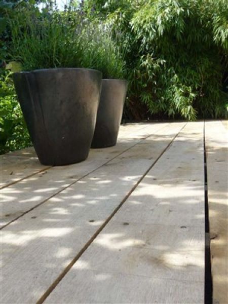 Eiken terrasplanken komen voort uit lokale Europese bossen. De voordelen van eik zijn gekend: duurzaam, sterk en een mooie vergrijzing. Een waardig alternatief voor tropisch hardhout. Deze fijnbezaagde eiken planken zorgen voor een heel natuurlijke robuuste look dankzij hun mooie breedte van 20 cm. Deze planken zijn nagenoeg splintervrij. Toch best even lichtjes opschuren om de laatste vezels weg te werken. Daarna bekomt u heel mooie goudgele planken die na verloop van tijd heel mooi gaan vergrijzen. Best houdt u er dus rekening mee dat dit in de meeste gevallen geen kant en klaar artikel is. Door deze planken zoals aangewezen te verzagen en in wildverband te plaatsen, bekomt u zeker een prachtig resultaat. Dikte: 2.7 cm Breedte ca. 20 cm lengte: 2.5 en 3 meter Fixatie met inox vijzen. Prijs per m² is incl. 1 cm spatie tussen de planken (= 4.76 Lm/m²)