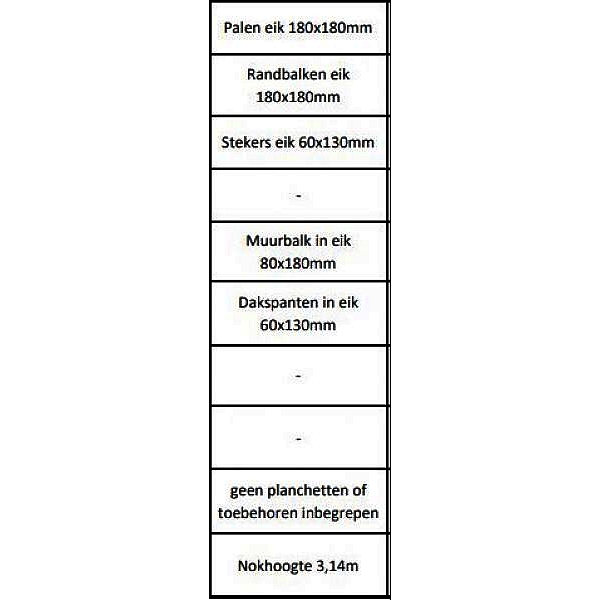 Het gebinte is verkrijgbaar in massieve Franse eik—een houtsoort die bekendstaat om haar robuustheid, levensduur en warme uitstraling. Je kiest hierbij uit twee varianten: