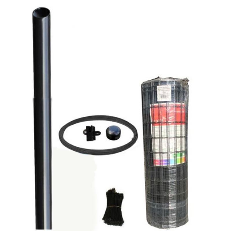 Alles wat je nodig hebt voor een draadomheining van 120 cm hoog zit in dit pakket: van de gelaste draad op rol en palen met doppen tot steunpalen, spandraadhouders en de benodigde span- en binddraad.