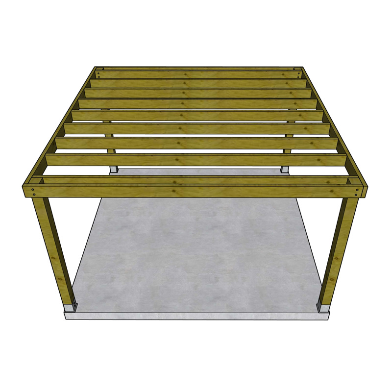 De montage verloopt eenvoudig en duidelijk. Je start met het plaatsen van de paalhoudervoeten met keilbouten, gevolgd door de vier staanders. Daarna monteer je de ringbalken en sluit je af met de dakspanten.