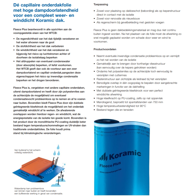 Koramic Fleece Plus is een premium onderdakfolie met een extra zachte fleece-binnenlaag die zorgt voor een betere stabiliteit en minder kans op beschadiging tijdens de plaatsing. De folie is volledig waterdicht langs buiten, maar dampopen langs binnen, zodat vocht geen schade veroorzaakt in de dakopbouw. Dankzij de sterke vezelstructuur is dit membraan zeer scheurvast, ook bij koude weersomstandigheden. De geïntegreerde PLUS-kleefstroken maken het eenvoudig om een perfecte luchtdichting te realiseren. De folie is geschikt voor zowel pannendaken als leien en vormt een betrouwbare basis voor een langdurige dakbescherming.