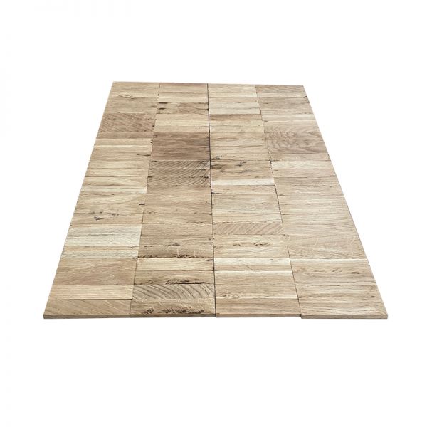 Dit mozaïek parket geeft een erg geometrische uitstraling voor uw interieur. Elke tegel van deze vloer bestaat uit aparte latjes die parallel liggen met elkaar. Zo komen ook alle naden met elkaar overeen en krijgt u geen wildverband. De perfecte uitstraling voor een strak en modern interieur of een waar u toch een tikkeltje rustiek verwacht. Deze parketvloer bestaat uit aparte tegels die u op een ondervloer vastlijmt. Deze ondervloer kan bestaan uit isolatieplaten met vervolgens een laag OSB platen bovenop. Daar brengt u een laag lijm op en kleeft vervolgens de parket tegels daarop vast. Deze vloer bestaat uit tegels van 32 centimeter op 64 centimeter en een dikte van 8 millimeter. U bestelt deze vloer per 20 stuks, waarmee u ongeveer 4,1 vierkante meter mee aanlegt. Deze vloer kan in twee verschillende afwerkingen worden aangelegd. Enerzijds hebben we de ‘Natuur’ parket, wat de meest kwalitatieve en nette uitstraling heeft. Deze tegels zijn beter gesorteerd voor een egalere uitstraling over heel uw vloer. De kleur kan zeer licht afwijken, maar ze hebben geen spint of knopen. De rustiek A parketvloer is nog steeds kwaliteitsvol, maar heeft een iets ruwere en landelijke uitstraling. Hier kunnen bijvoorbeeld wel knopen in zitten, maar zijn ze niet groter dan 10 millimeter. Ook hier tref je geen spint aan. Deze zijn iets meer budgetvriendelijk. Een concreet voorbeeld van het verschil in uitstraling vindt u bij de afbeeldingen van dit product. U kan deze mozaïek ondervloer ook gebruiken als ondervloer voor andere parketvloeren.