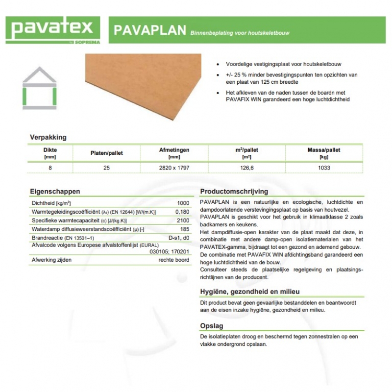 De Pavatex Pavaplan is een HDF-paneel (High Density Fibreboard). Deze soort panelen hebben een hogere densiteit dan MDF en zijn bijgevolg dus ook sterker en drukvaster. De Pavaplan zorgt voor stabiliteit bij een houtskeletbouw en is dampopen maar toch luchtdicht op voorwaarde dat ze op de juiste manier verwerkt worden.