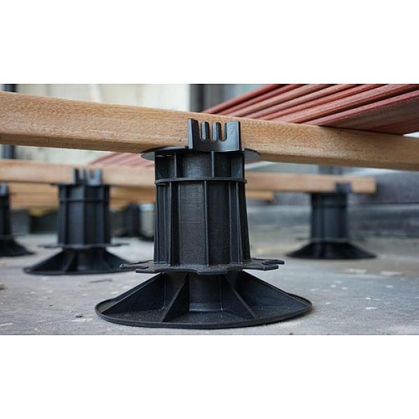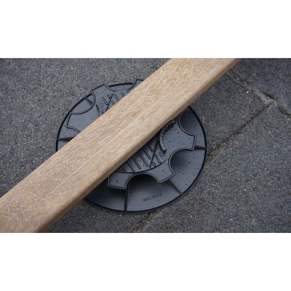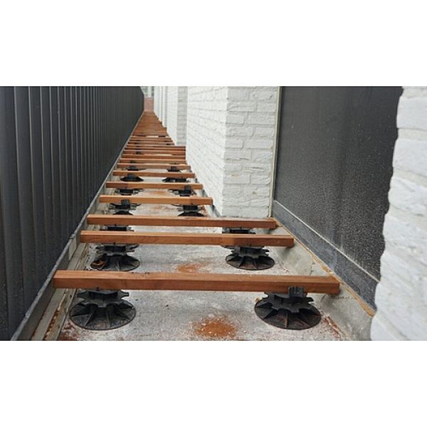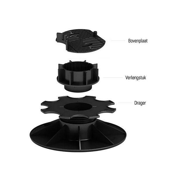 Deze terrasdrager met het ruime instelbereik van 14 tot 17 cm is ontworpen voor hoge terrasopbouwen waarbij flexibiliteit en stabiliteit essentieel zijn. Door zijn robuuste constructie en hoge belastbaarheid vormt deze drager een betrouwbare basis voor terrassen boven leidingen, op ongelijke ondergronden of in projecten waar extra hoogte noodzakelijk is. De traploze fijninstelling maakt het mogelijk om lange draagbalken perfect te nivelleren en het volledige terras waterpas te plaatsen. Zoals bij alle modellen is een bovenplaat verplicht voor correcte montage, en is de drager compatibel met 30 mm en 100 mm verlengstukken. Hierdoor kan het systeem worden aangepast aan quasi elke bouwsituatie, zonder aan stevigheid in te boeten.