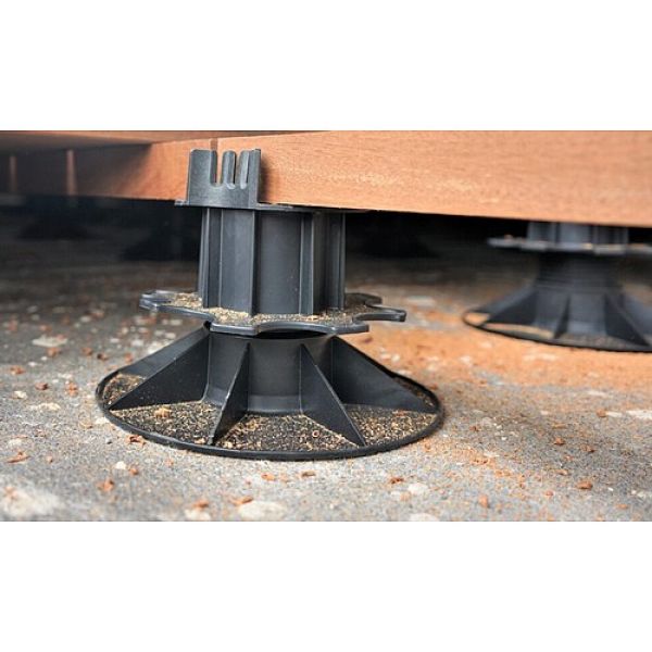 Deze regelbare terrasdrager met een bereik van 2,5 tot 3,5 cm vormt de ideale basis voor een lage opbouwhoogte. Dankzij de stevige kunststof constructie wordt het terras op een stabiele, nauwkeurig afstelbare drager geplaatst, waardoor oneffenheden in de ondergrond eenvoudig kunnen worden weggewerkt. Door de fijne hoogte-instelling kan je het terras exact waterpas zetten zonder gebruik van vulplaatjes of handmatig schuren. Dit maakt de montage snel, efficiënt en bijzonder professioneel. De drager is bestand tegen hoge druk, vorst, vocht en langdurige belasting, waardoor hij perfect geschikt is voor zowel houten, tropische als composiet terrasplanken. Voor elke drager is een bovenplaat verplicht en apart te bestellen, waardoor je het systeem kunt aanpassen aan jouw type onderbalk of structuur. Indien gewenst kan de drager worden verhoogd met een verlengstuk van 30 mm of 100 mm, waardoor hij flexibel inzetbaar blijft bij elke terrasopbouw.