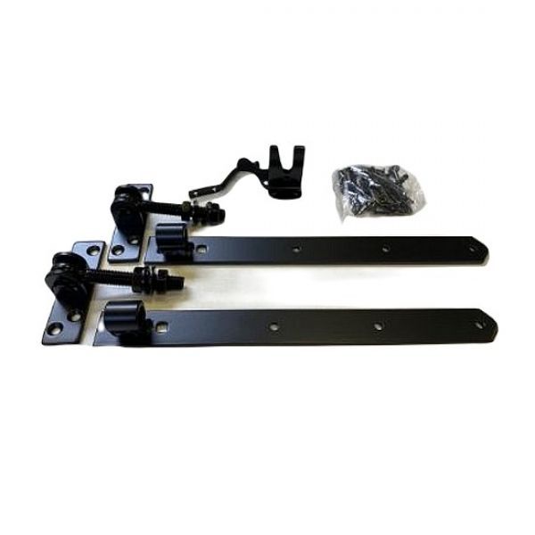 Deze set beslag voor lichte hekken en poortjes bestaat uit: 2 verstelbare duimhengen: plaat 130 x 35 mm, heng 400 x 40 mm 1 heksluiting met pen: 60 mm, dikte pen 8 mm Inclusief schroevenset.