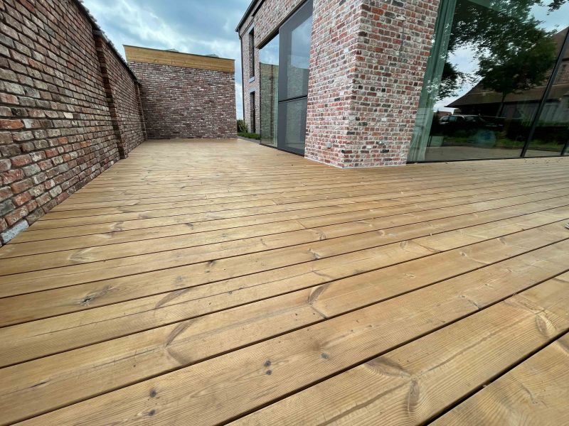 Door de thermische behandeling van het dennenhout wordt voor de thermowood terrasplanken eenzelfde duurzaamheid verkregen als tropisch hardhout (klasse 1). De planken zijn voor deze duurzaamheid dus zeer betaalbaar en kan u dus relatief goedkoop een prachtig terras aanleggen in thermowood! Je mag door deze kwaliteit en duurzaamheid tientallen jaren lang rekenen op een onderhoudsvrij terras. Voor deze terrasplanken in thermowood wordt enkel de beste kwaliteit binnen het dennenhout geselecteerd. Breedte: 18.5 cm Vaste lengte: 360 cm Dikte: 2.6 cm Deze thermowood planken hebben een vlakke bovenzijde met enkel heel fijne groefjes Fixatie kan enkel met vijzen of met zijwaartse clips voor onzichtbare fixatie Prijs per m² is inclusief 0.75 cm spatie tussen de planken.