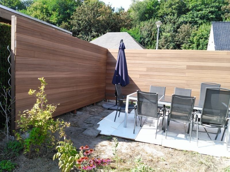 Wens je een strakke houten tuinafscheiding te plaatsen die visueel niet onderbroken wordt door de zichtbaarheid van palen? Dan is het plaatsen van een tuinwand ideaal. Door de horizontale plaatsing van de planchetten lijkt je tuinwand een stuk langer, ideaal dus voor de iets kleinere tuinen. Aan de voorzijde van de palen wordt de bekleding met houten planken voorzien. Hierdoor zijn de palen niet meer zichtbaar en verkrijg je een mooie en unieke wand. De zwarte aluminium bovenregel zorgt voor een moderne, hedendaagse touch aan je tuinwand. Net zoals andere tropische hardhoutsoorten bevat thermo ayous geen knopen in het hout, waardoor het een heel egale uitstraling heeft. Eenmaal vergrijsd is de look exact hetzelfde als bij afromosia en padouk. De effen of vlakke planchetten zorgen voor een strakke en rustige uitstraling. De voegen tussen alle planchetten zijn ook heel subtiel, waardoor het lijkt alsof jouw tuinwand bestaat uit een grote plank. Deze horizontale tuinwand wordt geplaatst in combinatie met hardhouten palen. Door de stoom- en hittebehandeling die het hout heeft ondergaan, behoort thermo ayous tot dezelfde duurzaamheidsklasse als tropisch hardhout. Deze planchetten zijn voorzien van tand en groef (V-groef of mussenbek/visbek) voor een mooie aaneensluiting van de planken, wat zal zorgen voor een subliem eindresultaat van uw project. De bovenregel is apart te bestellen.