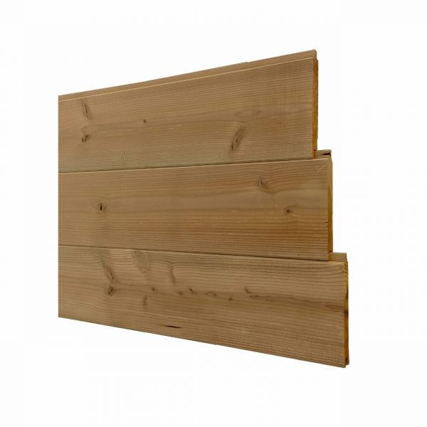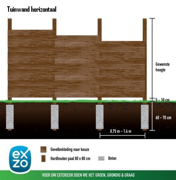 Bij het plaatsen van een tuinwand wordt gekozen om de bekleding met houten planken langs de voorzijde van de palen te voorzien. Hierdoor wordt een strakke houten tuinafsluiting bekomen die visueel niet onderbroken wordt door zichtbare palen. Door de horizontale plaatsing van de planchetten lijkt je tuinwand een stuk langer, ideaal dus voor de iets compactere tuinen. In combinatie met een aluminium bovenregel krijgt je tuinwand een hedendaagse en strakke uitstraling. Thermowood is thermisch behandeld dennenhout. Deze heeft origineel een geelbruine kleur maar vergrijst heel mooi. Typisch voor dennenhout is de aanwezigheid van knopen in het hout, die een mooie, levendige uitstraling geven. De effen of vlakke planchetten zorgen voor een strakke en rustige uitstraling. De voegen tussen alle planchetten zijn ook heel subtiel, waardoor het lijkt alsof jouw tuinwand bestaat uit een grote plank. Dankzij de thermische behandeling heeft thermowood eenzelfde duurzaamheidsklasse als tropisch hardhout. Bij een horizontale tuinwand worden hardhouten palen gebruikt. Deze worden afhankelijk van de lengte van de beschikbare planken elke 1 tot 1.2 m uit elkaar geplaatst. De aluminium bovenregels zijn apart te bestellen.