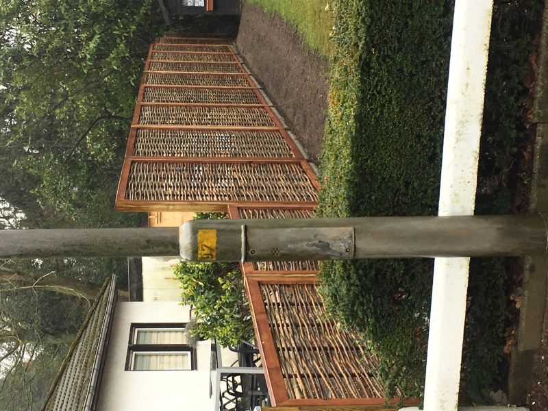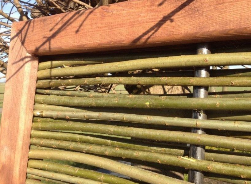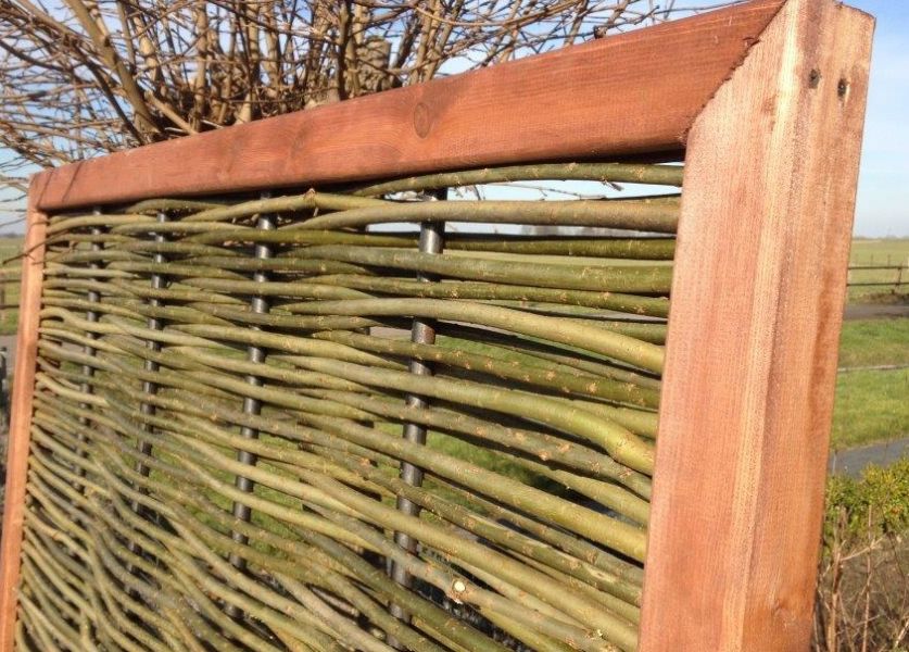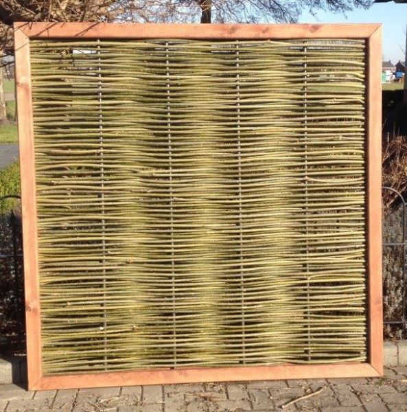 Deze natuurlijke tuinschermen zijn gevlochten/geweven met verse dikke 1 à 2 jarige wilgentakken binnen een mooi houten kader. Voor een mooi gevlochten geheel zitten de takken vast tussen 6 verticale metalen staanders. Zowel verticale als horizontale plaatsing mogelijk. Een heel degelijk, natuurlijk, strak en robuust tuinscherm. Deze gevlochten tuinomheining kan gecombineerd worden met een bijhorend poortje bestaande uit gevlochten wilgentakken in een stevig grenen kader. Deze afsluiting wordt het makkelijkst geplaatst tussen grenen palen van 7x7 of 9x9 cm.